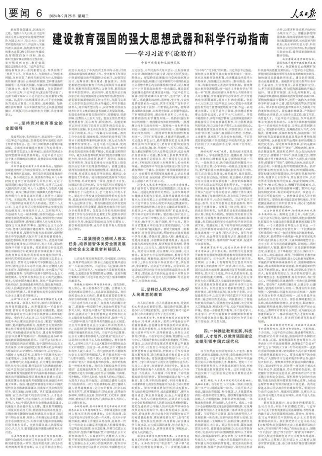 教育是民族振兴、社会进步的重要基石,是功在当代、利在千秋的德政工程。习近平总书记关于教育的重要论述高屋建瓴、思想深邃、内涵丰富,具有很强的政治性、思想性、指导性,是习近平新时代中国特色社会主义思想的重要组成部分。我们要把学习习近平总书记《论教育》和在全国教育大会上的重要讲话结合起来,深刻领悟“两个确立”的决定性意义,增强“四个意识”、坚定“四个自信”、做到“两个维护”,坚定不移走中国特色社会主义教育发展道路,以教育之力厚植人民幸福之本,以教育之强夯实国家富强之基,奋力谱写教育强国建设崭新篇章。